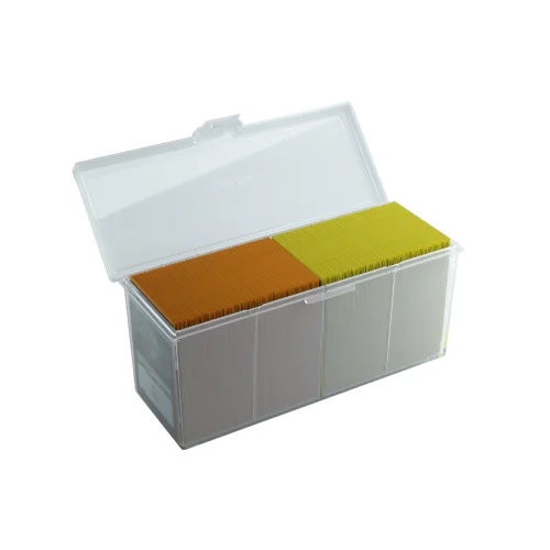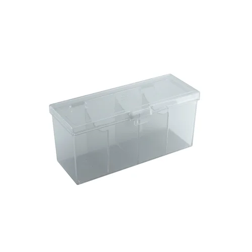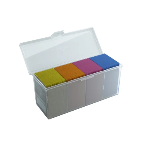 Mazos completos, dados, fichas o 320 cartas con protectores dobles: ¡hay muchas cosas que el Fourtress puede sostener y proteger! Este robusto portamazo está disponible en 5 colores semitransparentes diferentes, lo que permite que su contenido sea identificado fácilmente. La cerradura integrada lo mantiene cerrado de forma segura, además se pueden quitar dos paredes interiores para crear compartimentos más grandes. Las cajas son apilables, por lo que son a la vez compañeros de viaje perfectos y una gran solución para almacenamiento en casa.